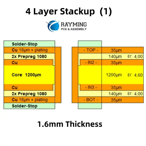 This stackup is widely used in consumer electronics, industrial controls, and communication devices. For more complex designs, higher layer counts (e.g., 6-layer or 8-layer PCBs) may be required.